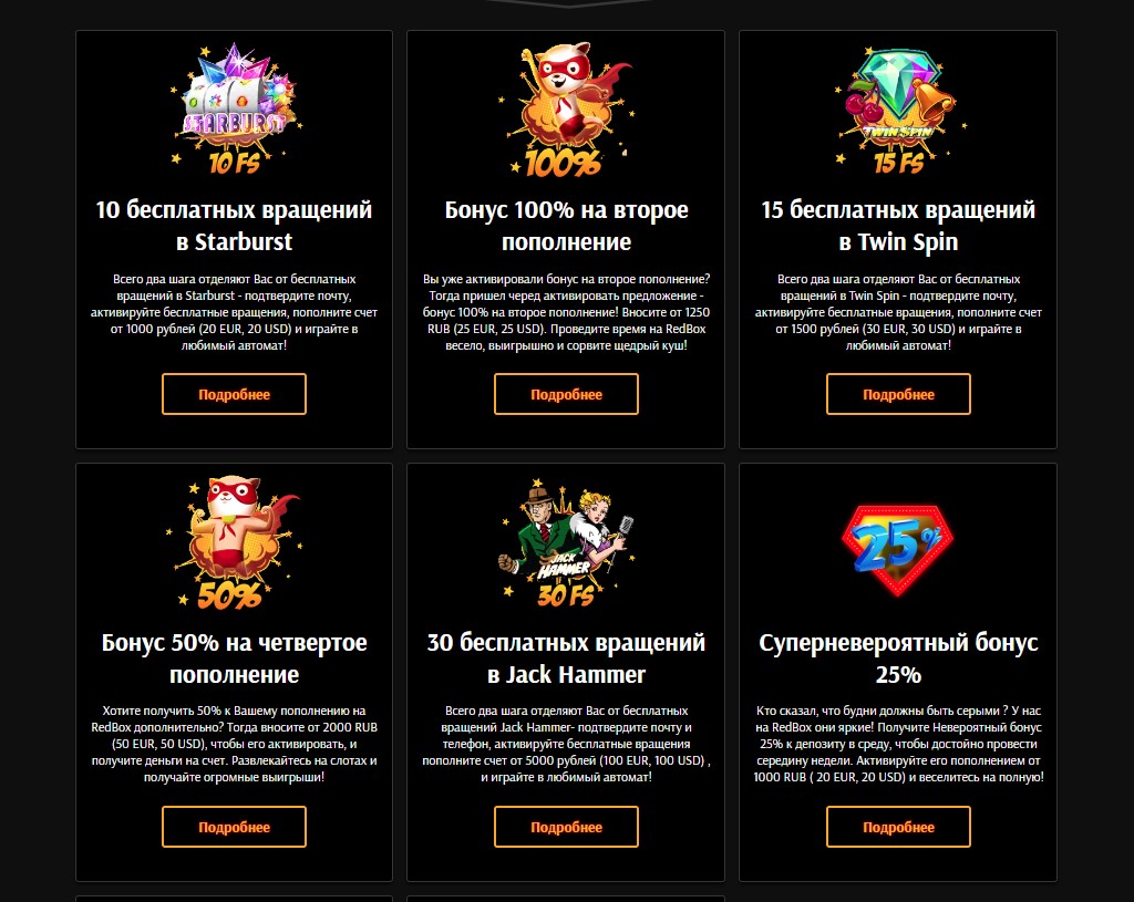 Еще больше подробностей о бонусной системе казино RedBox Вы можете узнать, зайдя на официальный сайт, отличительной чертой которого является изображение кота в супергеройском красном костюме, стоящего в красной коробке. Такое вряд ли спутаешь. Перестаньте довольствоваться малым. Мы ждем Вас! Желаем успехов и грандиозных побед!